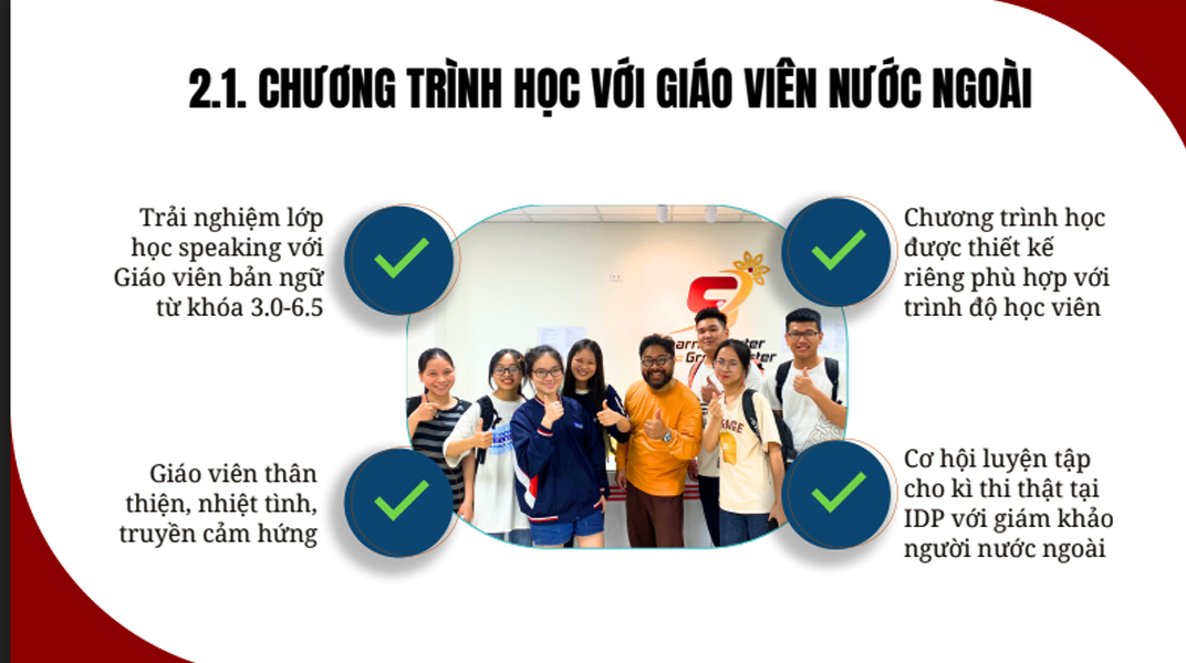 Ở Sedu English, học viên được tiếp cận với nhiều phương pháp thực tế và quy chuẩn như chương trình học với giảng viên nước ngoài, chương trình học với gia sư. Học viên cũng được Sedu English hỗ trợ thi thật tại IDP, hỗ trợ 30% học phí cho học viên có đầu ra 6.5 overall.