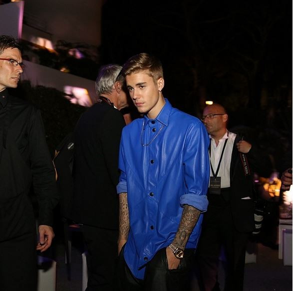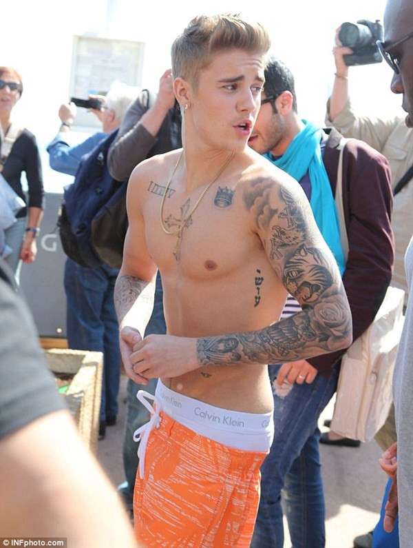 Gu thời trang "khoe hàng" gần đây của Justin Bieber khi xuất hiện tại Cannes, Pháp.