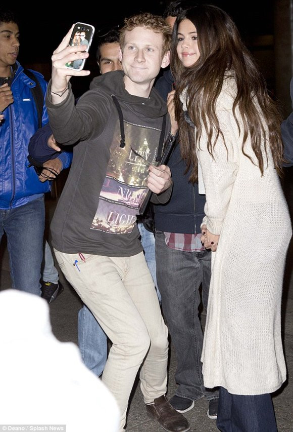 Selena ăn mặc khá giản dị với áo khoác len dài, quần jean ống loe, mái tóc xõa nữ tính. Gương mặt cô cũng rạng rỡ, thoải mái khi giao lưu và chụp ảnh cùng các fan.