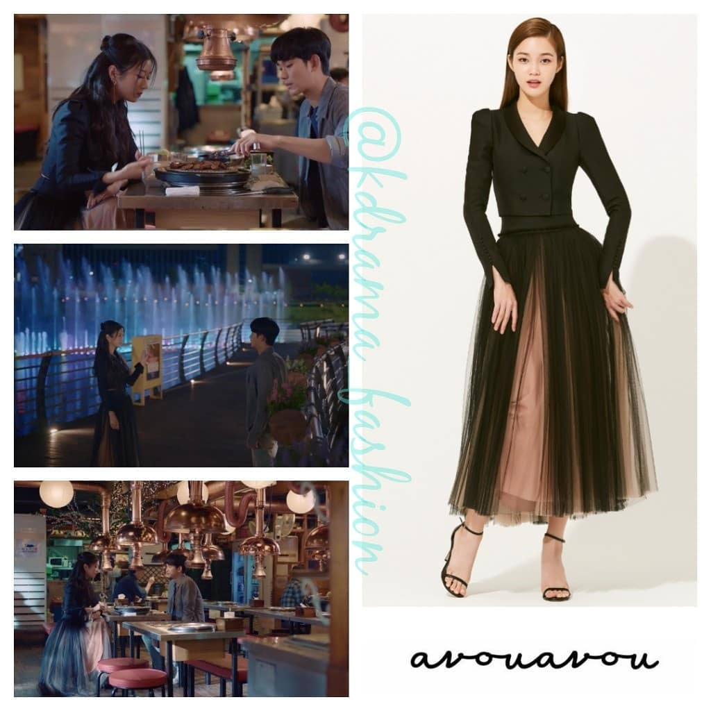 Nhân vật Ko Mun Yeong trong phân cảnh này của tập 8 mặc nguyên set váy của hãng AVOUAVOU, chiếc áo có giá khoảng 21,5 triệu đồng, chân váy được cắt ngắn hơn, mang đến hiệu quả khoe vòng eo "siêu thực" của Seo Ye Ji một cách tối đa, chân váy có giá khoảng 17 triệu đồng.