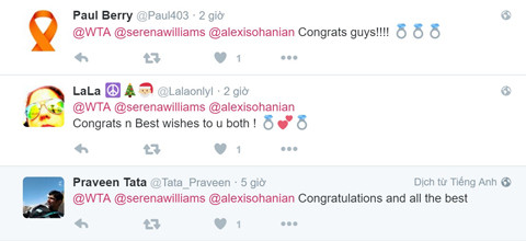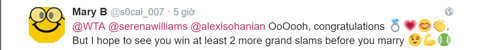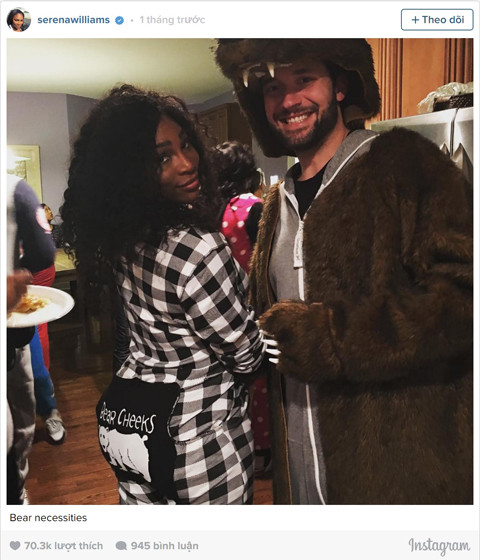 Cách đây 1 tháng, nữ tay vợt người Mỹ Serena Williams đã đăng tải một hình ảnh trên trang Instagram của mình. Hình ảnh cô và người bạn trai tin đồn Alexis Ohanian, đang trong trang phục hóa trang một chú gấu. Tưởng chừng như Serena Williams vẫn chưa có ý định tiến xa hơn, nhưng vào ngày hôm qua, trên trang Twitter chính thức của WTA đã đưa tin, rằng Serena và Ohanian đã đính hôn.