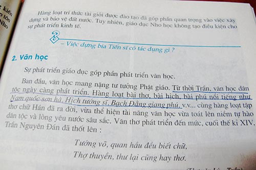Sách này còn viết “Từ thời Trần, văn học dân tộc ngày càng phát triển. Hàng loạt bài thơ, bài hịch, bài phú nổi tiếng như Nam quốc sơn hà, Hịch tướng sĩ, Bạch Đằng giang phú,… cùng hàng loạt tập thơ chữ Hán đã ra đời” (trang 103) có thể khiến học sinh hiểu rằng Nam quốc sơn hà ra đời từ thời Trần.