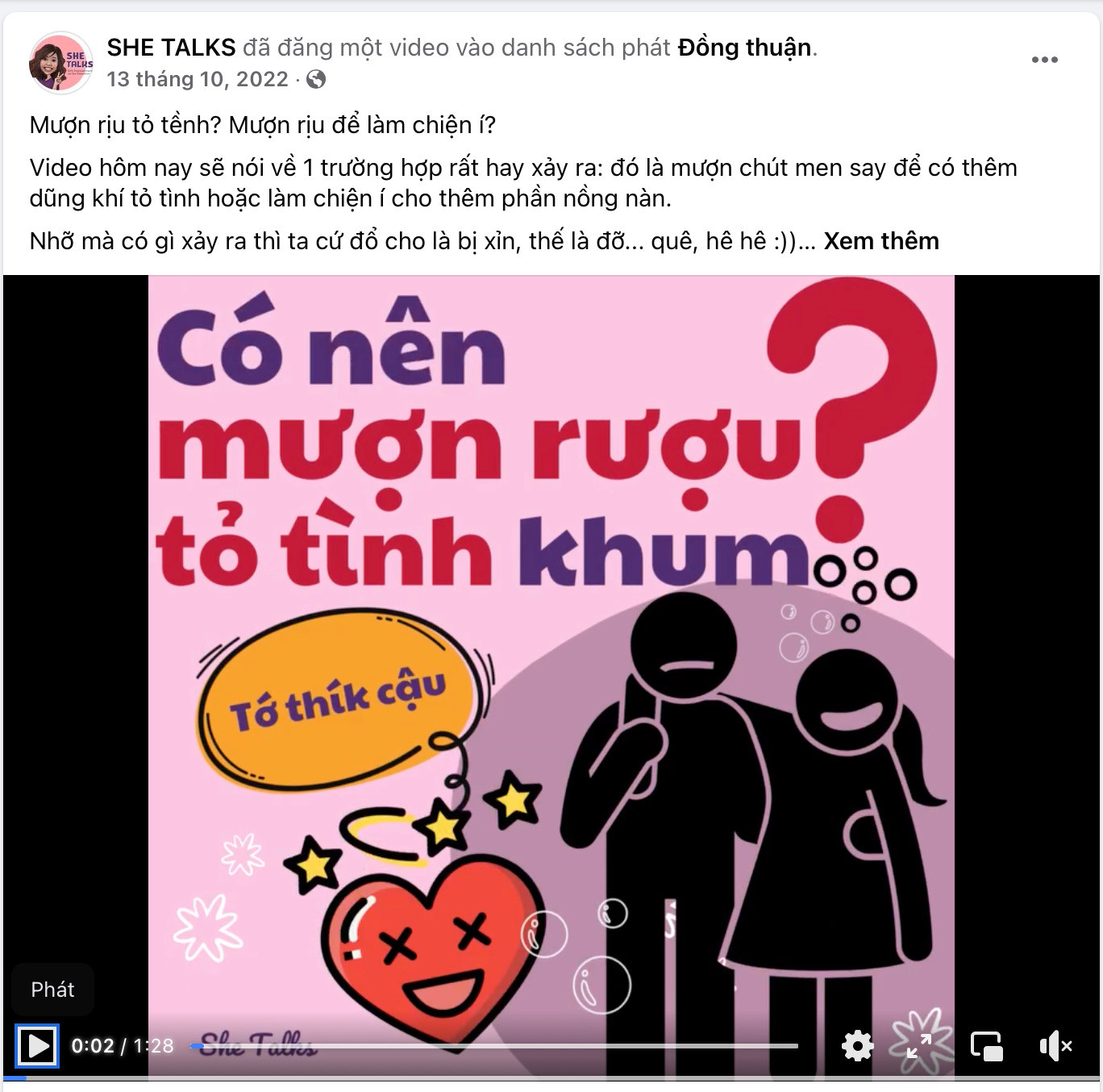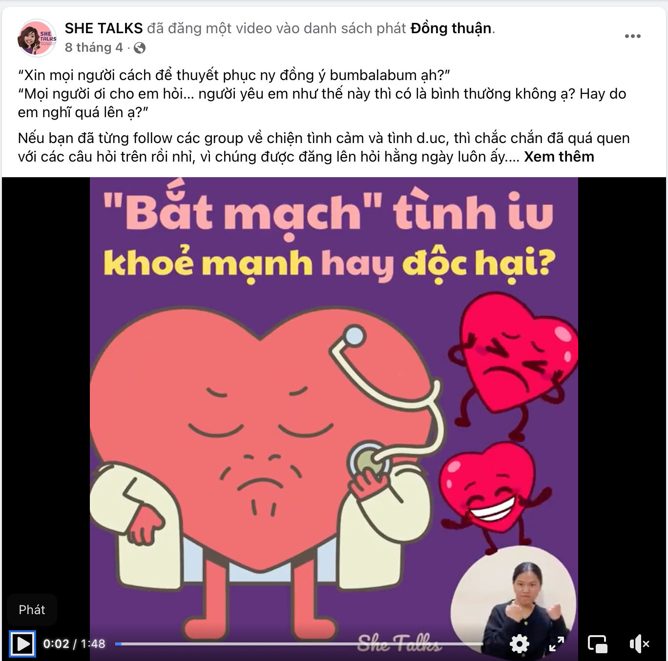 Vì thế khi nắm bắt được tâm lý đó, She Talks bắt đầu bằng những video hoạt hình nhẹ nhàng nhất, chờ đợi sự chuyển giao từ "ngại", sợ mọi người đánh giá sang "yêu" và sẵn sàng trở thành sứ giả lan toả những kiến thức này.