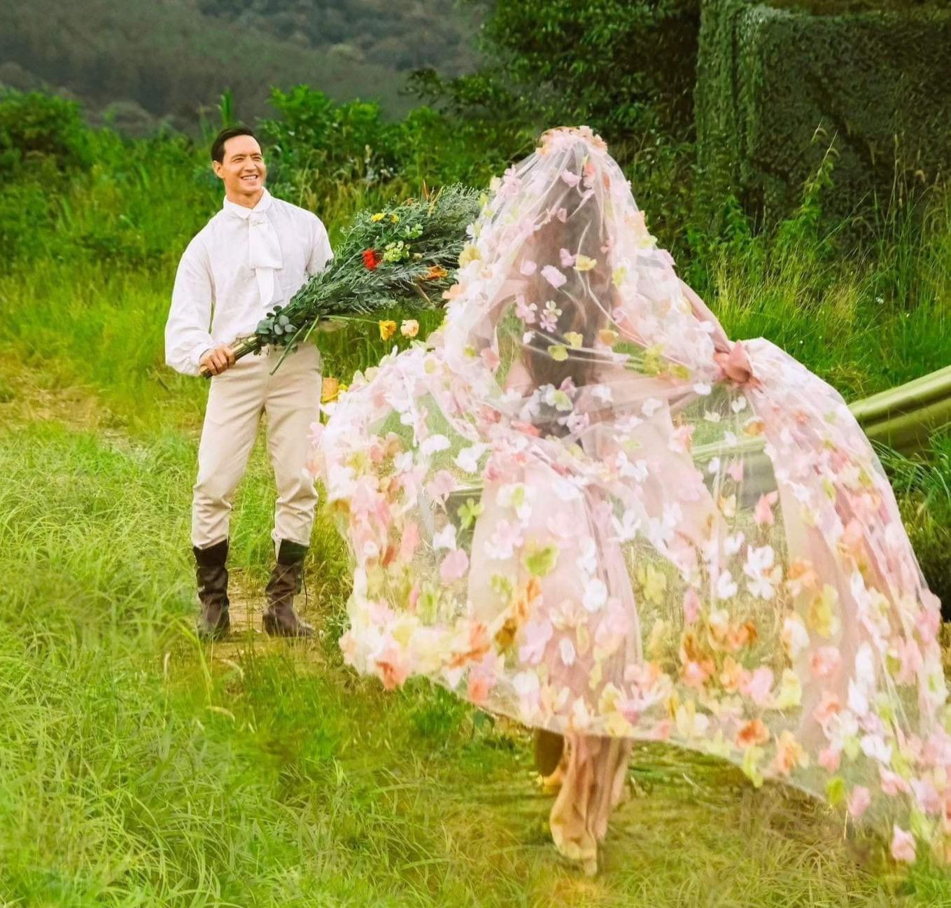 Tối 9/11, Kim Lý chia sẻ khoảnh khắc anh nở nụ cười tươi, ôm bó hoa lớn trong khi Hồ Ngọc Hà mặc váy cô dâu chạy về trước. Nam diễn viên Hương Ga đăng tải kèm dòng trạng thái ngọt ngào: “Cảm ơn em đã xuất hiện trong cuộc đời anh”.