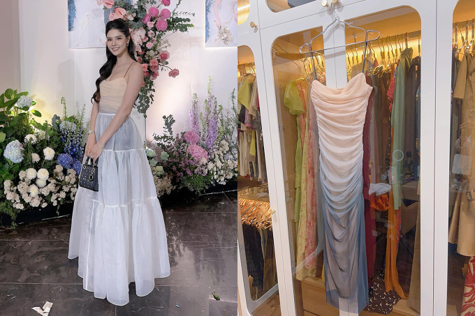 "Chiếc đầm hai dây có tông be và ghi, phù hợp dress code tiệc cưới của cô dâu chú rể. Vì đang đeo gen nịt bụng, tôi mix thêm chân váy tơ phồng để không bị lộ", Kỳ Hân nói.