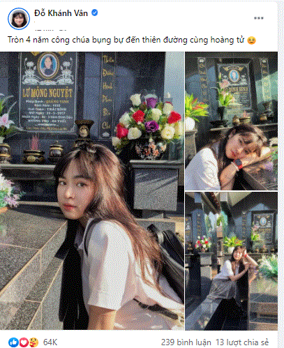 Mới đây, Khánh Vân đã đăng lên trên trang cá nhân loạt hình ảnh tại bia mộ cùng dòng chia sẻ: "Tròn 4 năm công chúa bụng bự đến thiên đường cùng hoàng tử". Trong bức ảnh, nữ diễn viên tạo dáng tựa tay nghiêng đầu vào bia mộ, khoe góc mặt nàng thơ. Tuy nhiên, ngay sau khi đăng tải bộ ảnh trên mạng xã hội, nữ diễn viên “Mắt biếc” vấp phải nhiều làn sóng tranh cãi từ cộng đồng mạng. Nhiều bình luận chia sẻ quan điểm: “Mộ là nơi yên nghỉ của người quá cố, không nên công khai hình ảnh hay tạo dáng như vậy nhìn rất phản cảm; sao ra thăm mộ lại nghiêng ngả như vậy, …” (XEM CHI TIẾT)