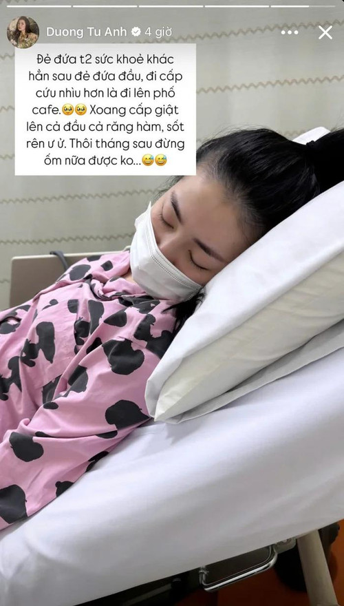 "Đi cấp cứu nhiều hơn là lên phố đi cà phê. Xoang cấp giật lên cả đầu và răng hàm, sốt rên ư ử. Thôi tháng sau đừng ốm nữa được không?", Tú Anh chia sẻ.