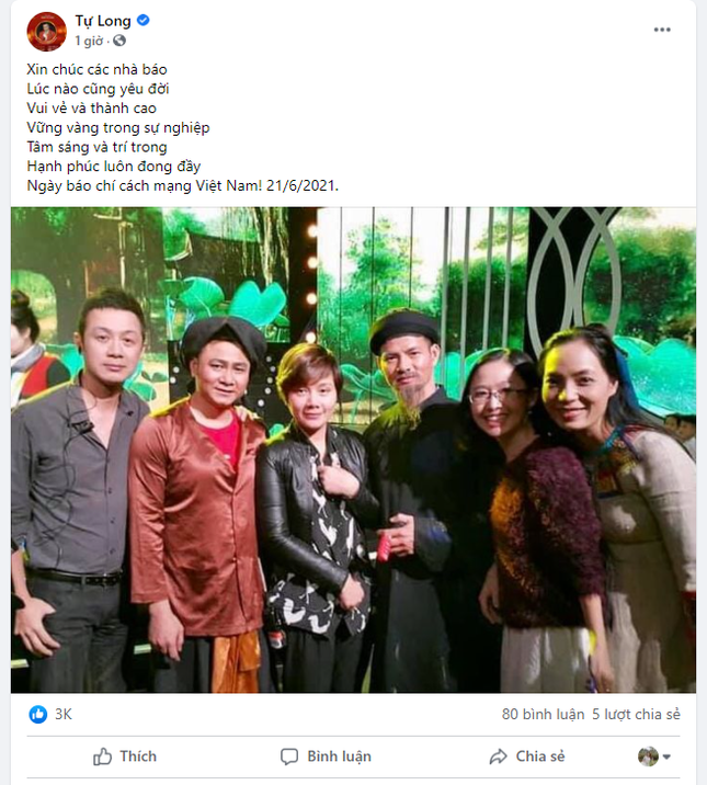 Trên trang cá nhân, NSND Tự Long gửi lời chúc tới các nhà báo bằng bài thơ "Xin chúc các nhà báo / Lúc nào cũng yêu đời / Vui vẻ và thanh cao / Vững vàng trong sự nghiệp / Tâm sáng và trí trong / Hạnh phúc luôn đong đầy/ Ngày báo chí cách mạng Việt Nam! 21/6/2021" (XEM CHI TIẾT)