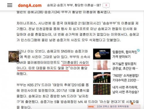 Mới đây nhất theo tờ DongA, công ty quản lý của Song Joong Ki và Song Hye Kyo đã chính thức lên tiếng về tin đồn ly hôn. Blossom Entertainment và UAA (United Artists Agency) thậm chí còn không đưa ra thông cáo riêng biệt của từng công ty mà đồng lòng: "Đó không phải là sự thật. Chúng tôi sẽ không đưa ra phản hồi riêng biệt".