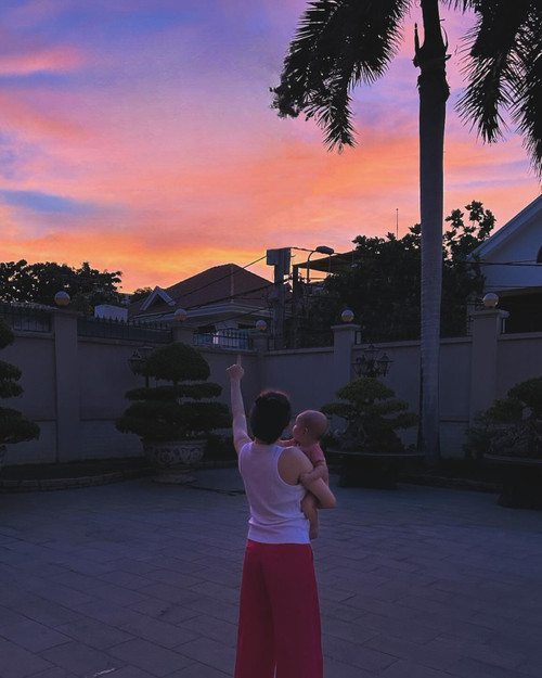 Linh Rin đăng tải ảnh bế con gái 5 tháng tuổi ngắm hoàng hôn trong sân nhà. Cô viết: “Em nhìn kia kìa bầu trời bao la. Còn tôi sẽ viết cho em thật nhiều bản tình ca, vì em đã có được tất cả tình yêu của tôi em à”.