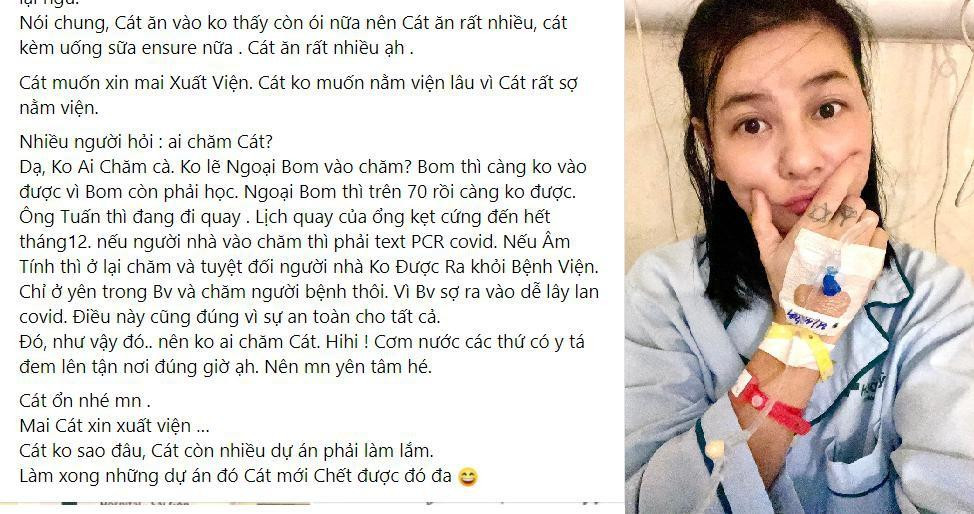 Liên quan đến sự việc nghệ sĩ Cát Phượng nhập viện khiến nhiều người lo lắng, Cát Phượng chính thức chia sẻ câu chuyện và giải thích về sự vắng mặt của bạn trai Kiều Minh Tuấn. Cô cho hay: "Nhiều người hỏi : Ai chăm Cát? Dạ, không ai chăm cả. Bom phải đi học, bà ngoài Bom cũng hơn 70 rồi. Ông Tuấn thì đang đi quay kẹt tới hết tháng 12. Nếu người nhà vào chăm thì phải test PCR Covid....". Tuy không có người thân nhưng nữ nghệ sĩ khẳng định vẫn nhận được sự chăm sóc chu đáo từ y bác sĩ và y tá. Hiện, nữ nghệ sĩ chuẩn bị xuất viện. (XEM CHI TIẾT)