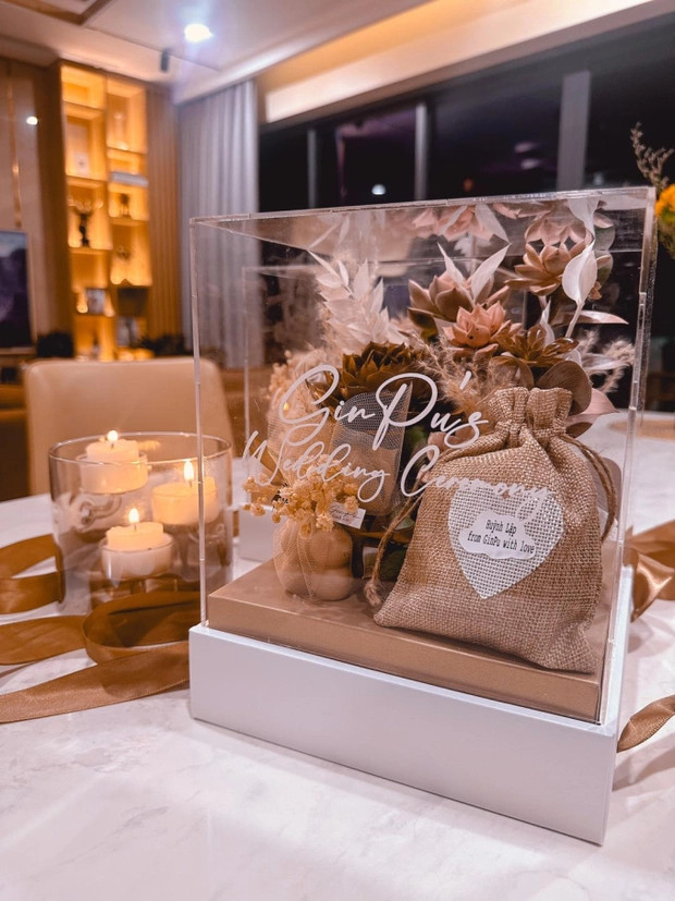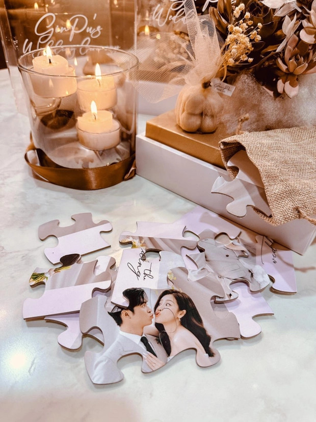 Theo đó, Puka và Gin Tuấn Kiệt gửi thiệp cưới tới các khách mời bên trong một hộp sen đá. Cặp đôi cũng gửi kèm nến thơm, túi vải có dán tên riêng của từng khách mời. Huỳnh Lập cho biết Gin Tuấn Kiệt và Puka đã rất kỳ công khi lên ý tưởng cho hộp thiệp cưới này. Đặc biệt, khách mời phải tự tay sắp xếp những mảnh ghép từ ảnh cưới của cặp đôi mới biết địa điểm, thời gian tổ chức hôn lễ.