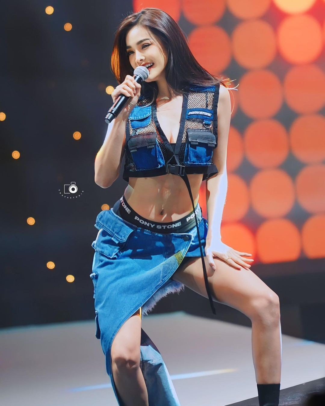 Hoa hậu Hòa bình Thái Lan 2022 Engfa Wahara mặc áo ngực màu đen, kết hợp với quần jeans ống xuông. Cô vốn là ca sĩ chuyên nghiệp nên có phong cách biểu diễn tự tin trên sân khấu. (Đọc chi tiết)