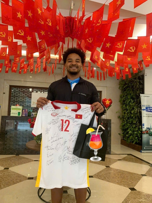 Tối 2/6, Việt Hương chia sẻ hình ảnh cầu thủ Nguyễn Xuân Son cầm chiếc áo thi đấu có chữ ký của cô và nhiều nghệ sĩ khác. Món quà này được chồng cô - nghệ sĩ Hoài Phương - trực tiếp mang ra Hà Nội trao tận tay cho nam cầu thủ, giữ đúng lời hứa trước đó.