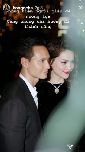 Mới đây, Hồ Ngọc Hà chia sẻ hình ảnh cô chụp cùng Kim Lý kèm lời nhắn nhủ: "Không kiếm người giàu để nương tựa. Cùng chung chí hướng để thành công".