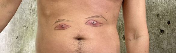 Chia sẻ với Tiền Phong, diễn viên Huỳnh Hồng Loan cho biết sau một thời gian đóng cảnh dầm suối, da Thái Hòa bị nổi mụn nhọt, nhức nhối. Những vết mủ sưng tấy được Thái Hòa hài hước vẽ thêm mắt, lông mày.
