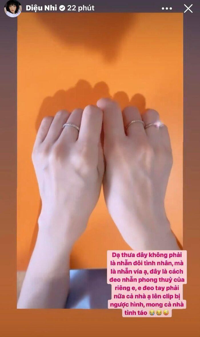 Trước tin đồn từ phía cư dân mạng, Diệu Nhi đã đích thân lên tiếng về nghi vấn trên. Trên Instagram, cô viết: "Dạ thưa đây không phải là nhẫn đôi tình nhân mà là nhẫn vía ạ. Đây là cách đeo nhẫn phong thủy của riêng em, em đeo tay phải nữa cả nhà ạ. Lên clip bị ngược hình, mong cả nhà tỉnh táo". Đây là một trong những lần hiếm hoi mà nữ diễn viên lên tiếng về những đồn đoán trong chuyện tình cảm của mình. (Saostar)