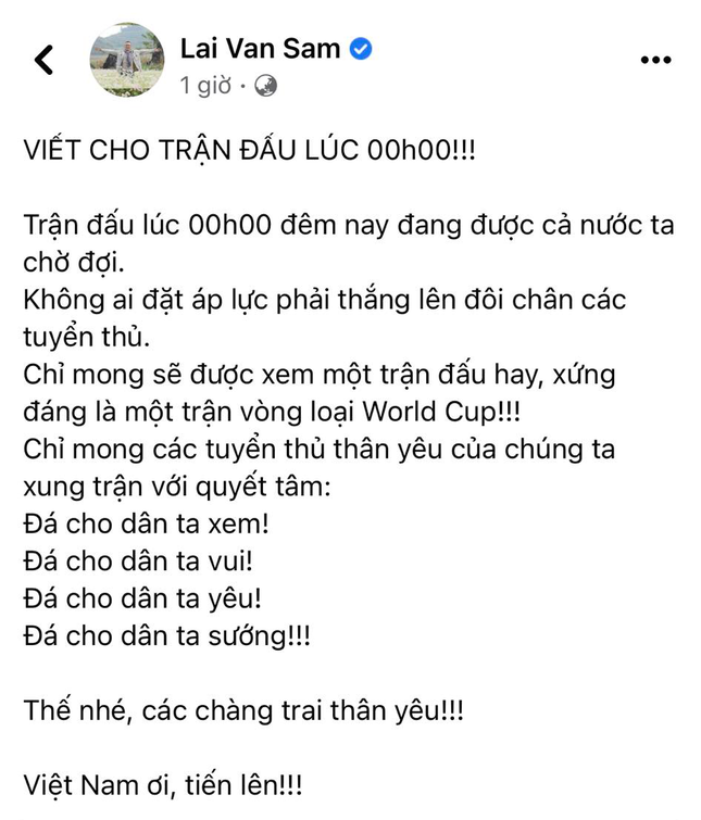 Trước giờ bóng lăn, MC Lại Văn Sâm, BLV Tạ Biên Cương đã có những chia sẻ động viên các cầu thủ của Đội tuyển Việt Nam, còn diễn viên Chí Nhân trổ tài dự đoán tỉ số và trông chờ Quang Hải sẽ tỏa sáng với bàn thắng vào lưới tuyển Trung Quốc. (XEM CHI TIẾT)