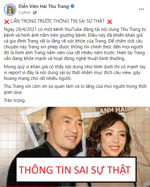 Mới đây, trên fanpage chính thức, diễn viên hài Thu Trang chia sẻ thông tin bị 1 kênh Youtube đưa tin sai sự thật. Theo đó, kênh này đăng tải clip bà xã Tiến Luật đang nằm trong bệnh viện khiến dư luận vô cùng hoang mang. Thu Trang bức xúc viết: "Ngày 29/4/2021 có một kênh YouTube đăng tải nội dung Thu Trang bị bệnh và hình ảnh nằm trên giường bệnh. Điều này đã khiến khán giả và gia đình Trang rất lo lắng về sức khỏe của Trang. Để chấm dứt câu chuyện này Trang xin phép được thông tin chính thức đến mọi người đó là hình ảnh Trang nằm viện của rất nhiều năm trước. Hiện tại Trang vẫn đang khỏe mạnh và hoạt động nghệ thuật bình thường". Nhiều khán giả bày tỏ sự đồng cảm và chia sẻ với Thu Trang khi cô là người nổi tiếng theo trở thành nạn nhân của những thông tin bịa đặt, sai sự thật nhằm câu view.