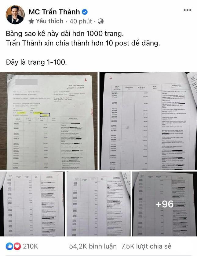 Sau nhiều ngày giữ im lặng khi bị cư dân mạng yêu cầu sao kê khoản tiền từng kêu gọi làm từ thiện, Trấn Thành đã có bài đăng trên fanpage 18 triệu người theo dõi vào chiều ngày 7/9. Nam MC công khai 100 trang sao kê đầu tiên có mộc đỏ của ngân hàng số tiền ủng hộ miền Trung gặp lũ lụt từ 15/10/2020 - 18/10/2020. (XEM CHI TIẾT)