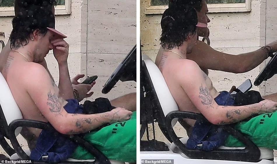Hôm thứ Năm (7/4), Brooklyn Beckham được nhìn thấy ngồi trên xe điện chạy trong khuôn viên dinh dự của gia đình vị hôn thê Nicola Peltz ở Palm Beach, Florida, Mỹ. Con trai cả của Victoria và David Beckham dường như vừa kết thúc trận đấu bóng rổ cùng bạn bè. Chú rể tương lai cởi trần để lộ làn da bị cháy nắng và rất nhiều hình xăm trên cơ thể. Đáng chú ý hơn, Brooklyn trông khá mệt mỏi trước hai ngày diễn ra đám cưới. Cùng thời điểm, Romeo Beckham đang cùng bạn gái Mia Regan đi nghỉ trên du thuyền hạng sang trị giá 6,5 triệu USD do người cha nổi tiếng mới tậu tại Miami, Florida, Mỹ. (XEM CHI TIẾT)