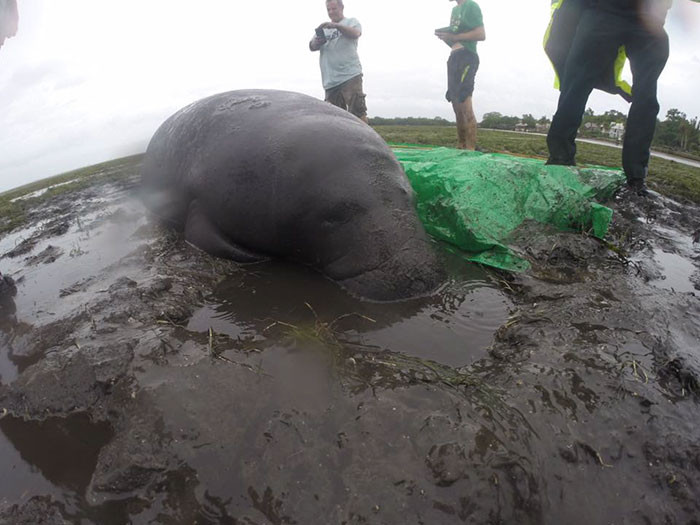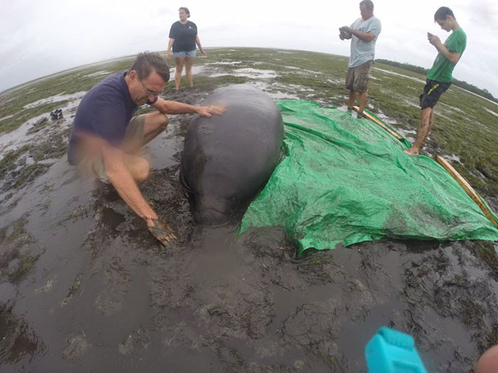 Chú lợn biển mắc cạn đang được cứu giúp bởi đội cứu hộ nơi đây.