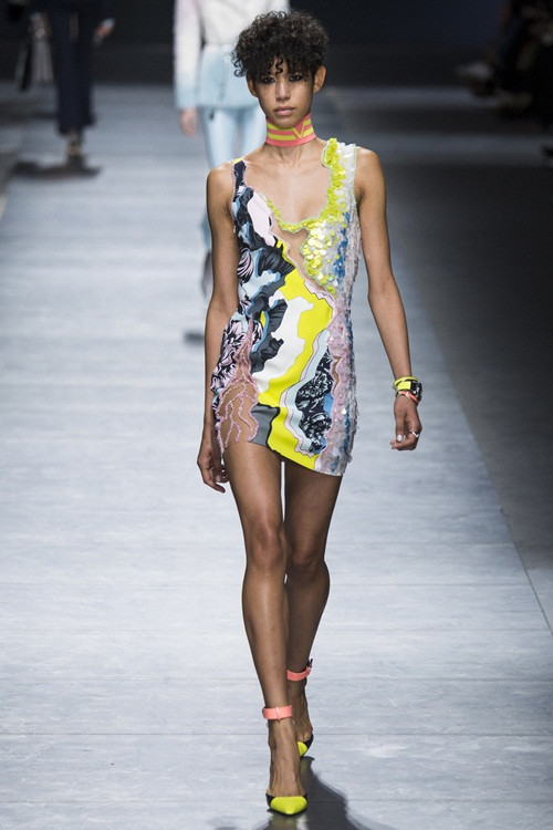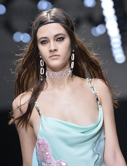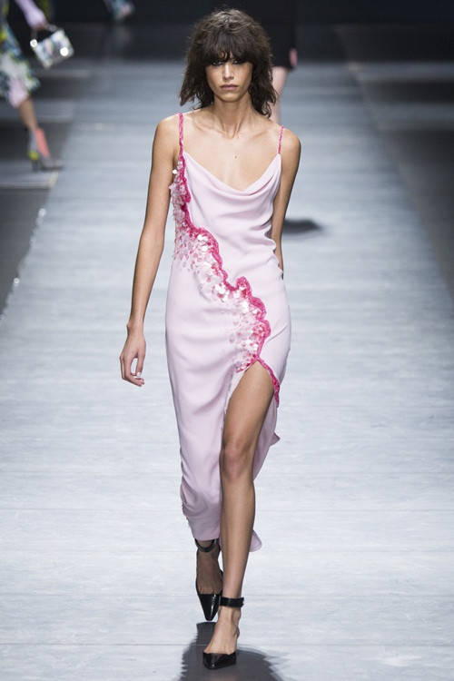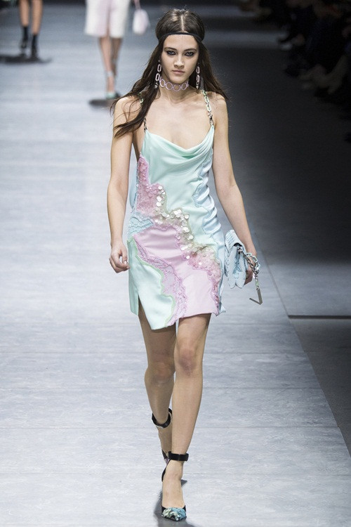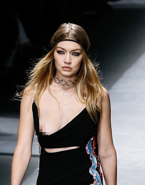 Trong một thiết kế váy ngắn khác, người mẫu cũng bị hở ngực trong lúc catwalk. Trang phục dành cho mùa Xuân Hè 2016 trình diễn ở Tuần thời trang Paris năm ngoái, Versace cũng nằm trong số nhiều nhà mốt cổ vũ mốt "ngực trần", giải phóng cơ thể phụ nữ.