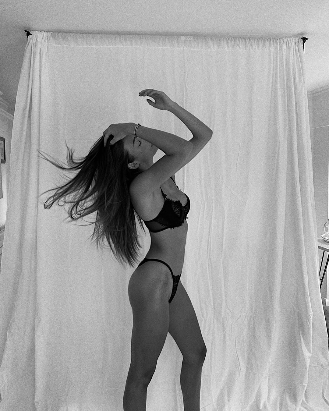 Chỉ dựng một tấm rèm trắng, người đẹp đã biến không gian trong căn hộ thành một studio nhỏ tại gia và tạo nên những bức ảnh đen trắng ấn tượng.