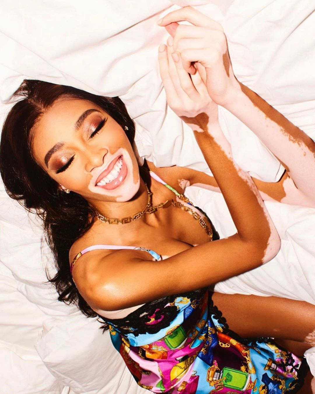 Winnie Harlow sành điệu trong một mẫu váy gợi cảm của Versace mới đây.