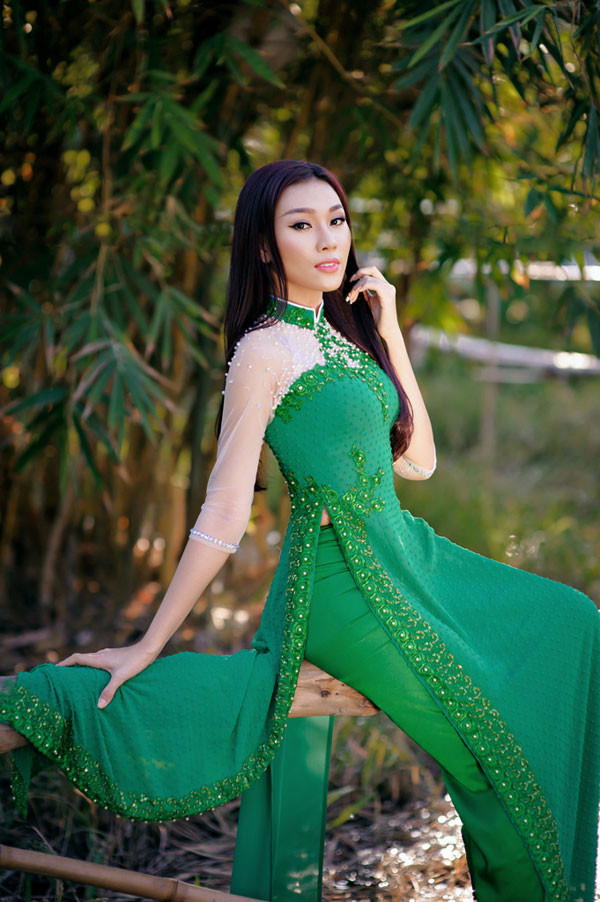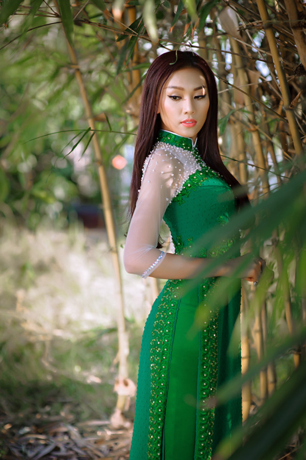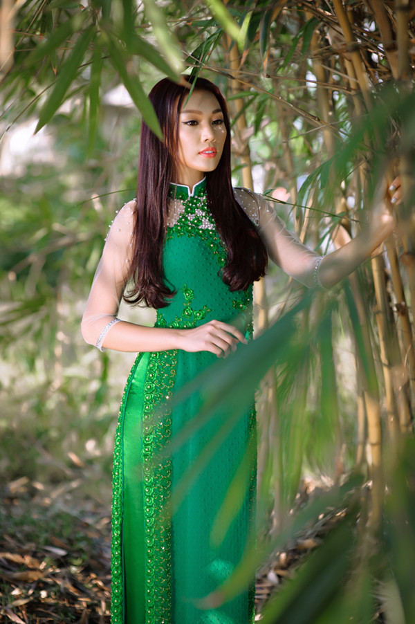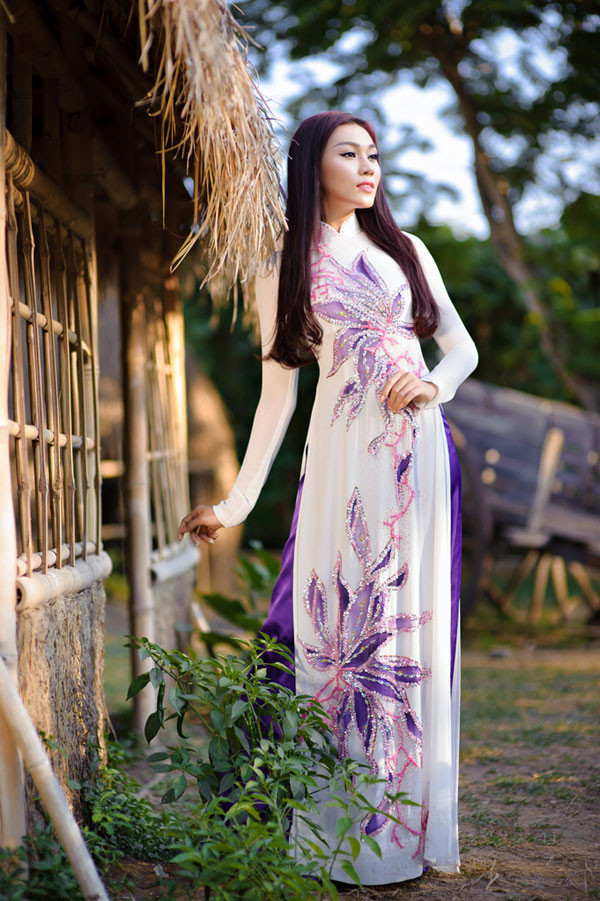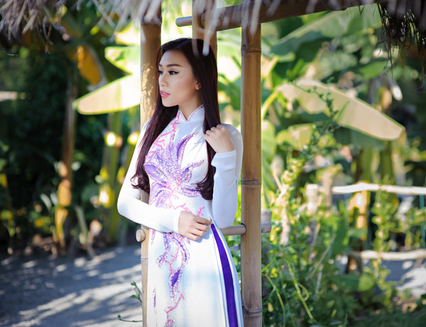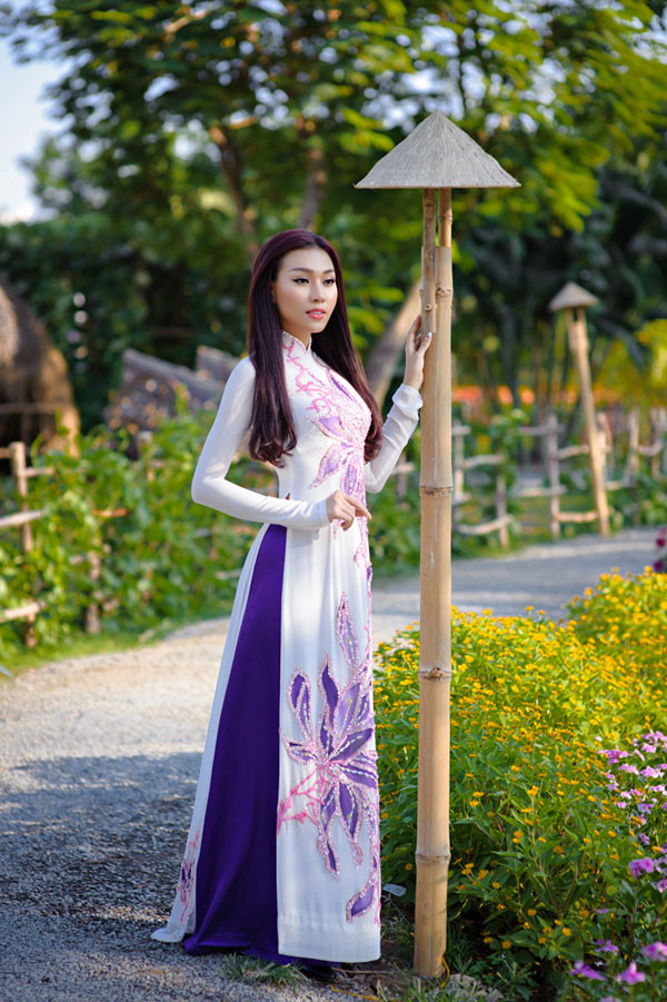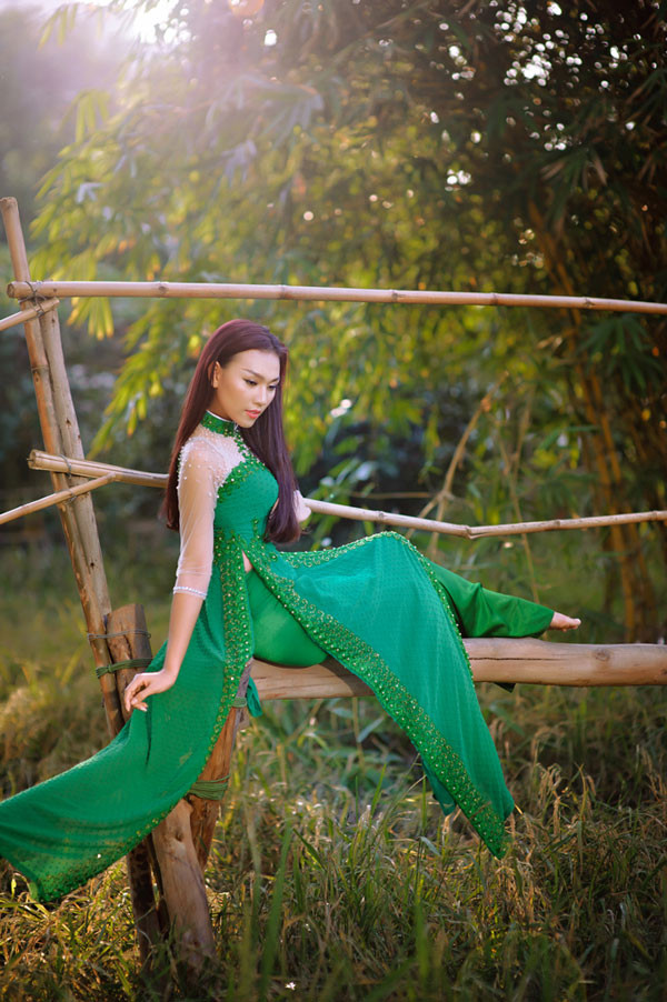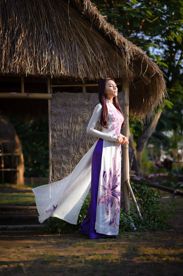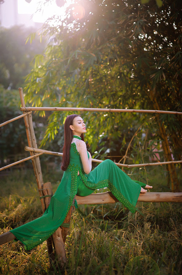 Nữ người mẫu vốn nổi tiếng với vẻ đẹp hiện đại, gợi cảm cũng rất dịu dàng trong tà áo dài.