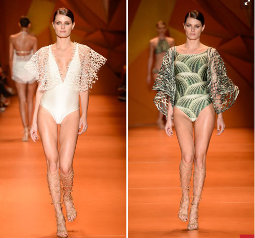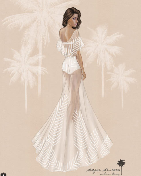Thực chất bộ đầm cưới của Isabeli Fontana không phải váy cưới mà lại là áo tắm. Bên ngoài bộ đồ bơi cúp ngực tròn và quần cạp cao, Isabel mặc thêm cover-up (áo, váy choàng đi biển) dạng váy bằng tuyn mỏng manh. Trên nền vải tuyn mờ ảo của váy choàng được trang trí bằng những chi tiết thêu rất tinh tế.