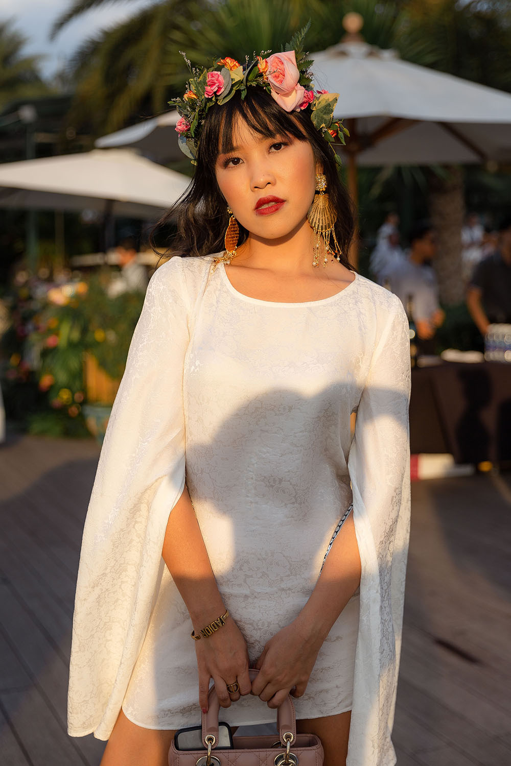 Em gái Hà Anh cũng tới ủng hộ chị ruột. Cô diện váy trắng dáng cape lạ mắt đầy lãng mạn.