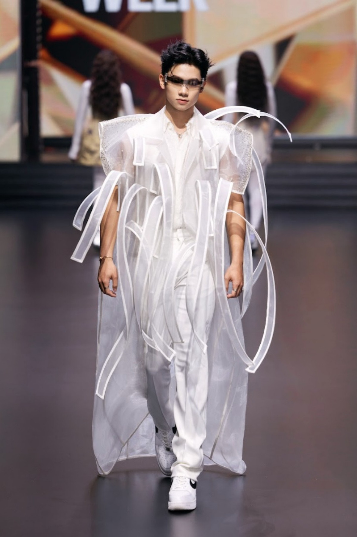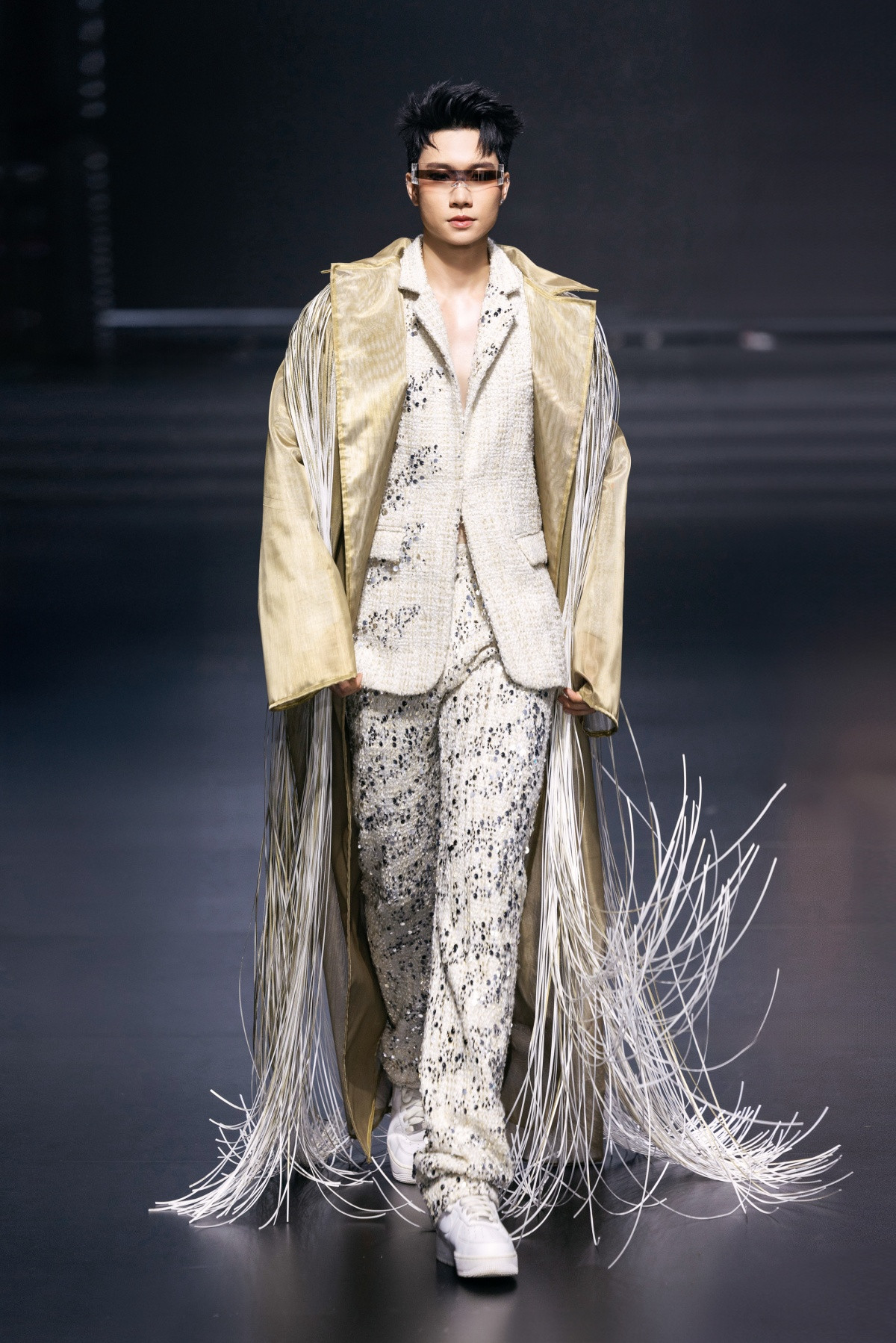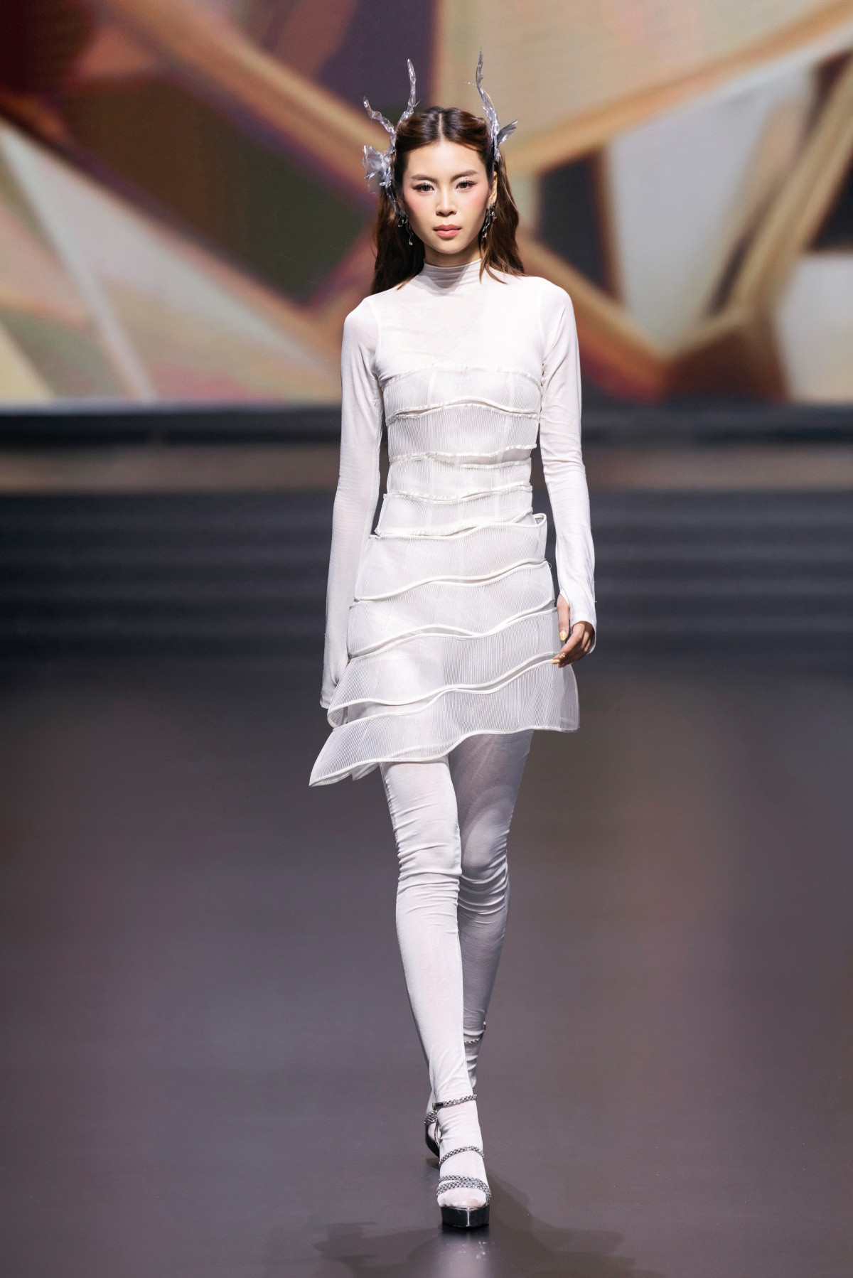Với Aura Bloom, NTK Ivan Trần không chỉ làm mới bản thân trong thiết kế mà còn thể hiện chiều sâu tư duy thời trang bằng những đường cắt bất đối xứng, chi tiết rút nhún hay nếp gấp được sắp đặt như một bản hòa âm thị giác.