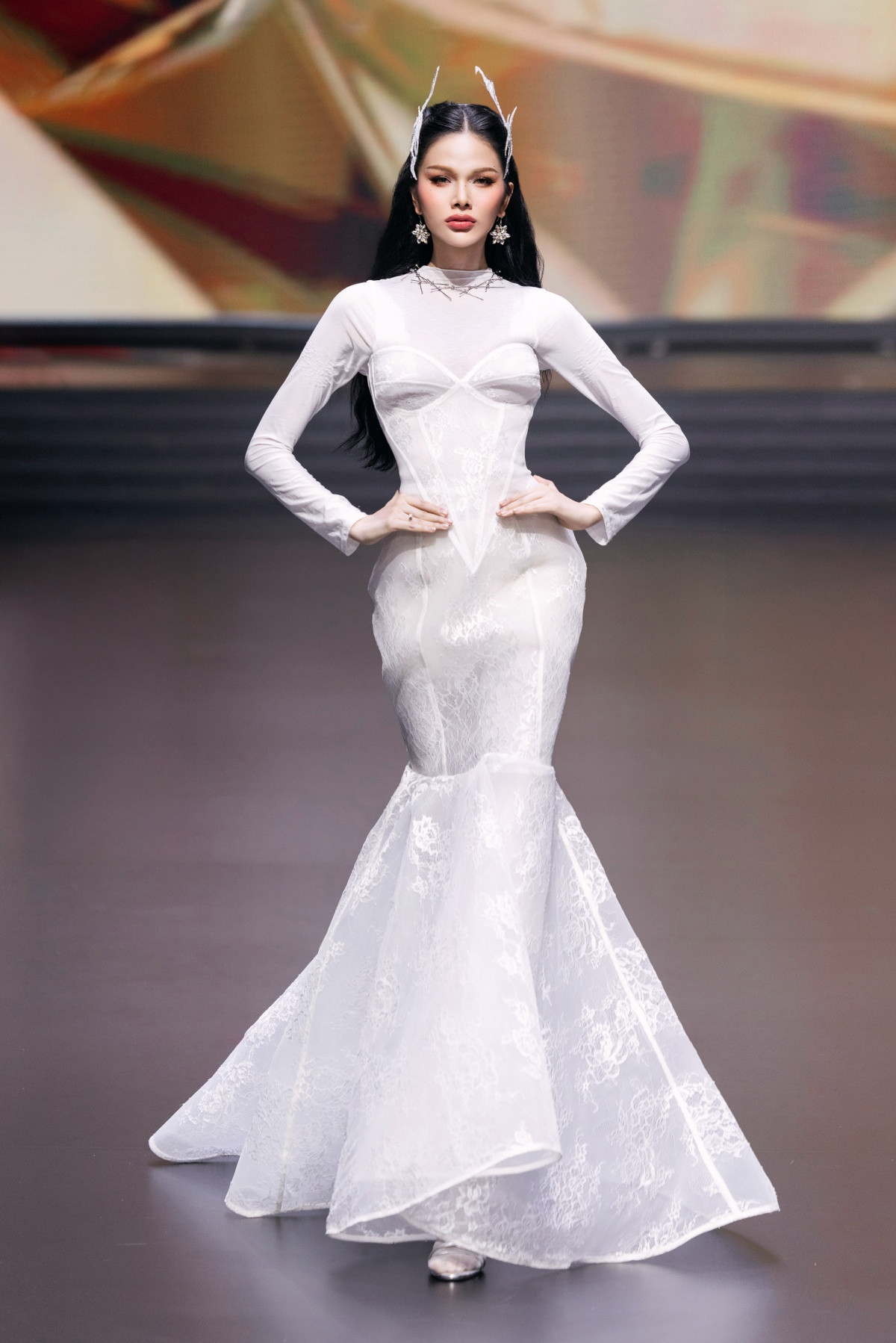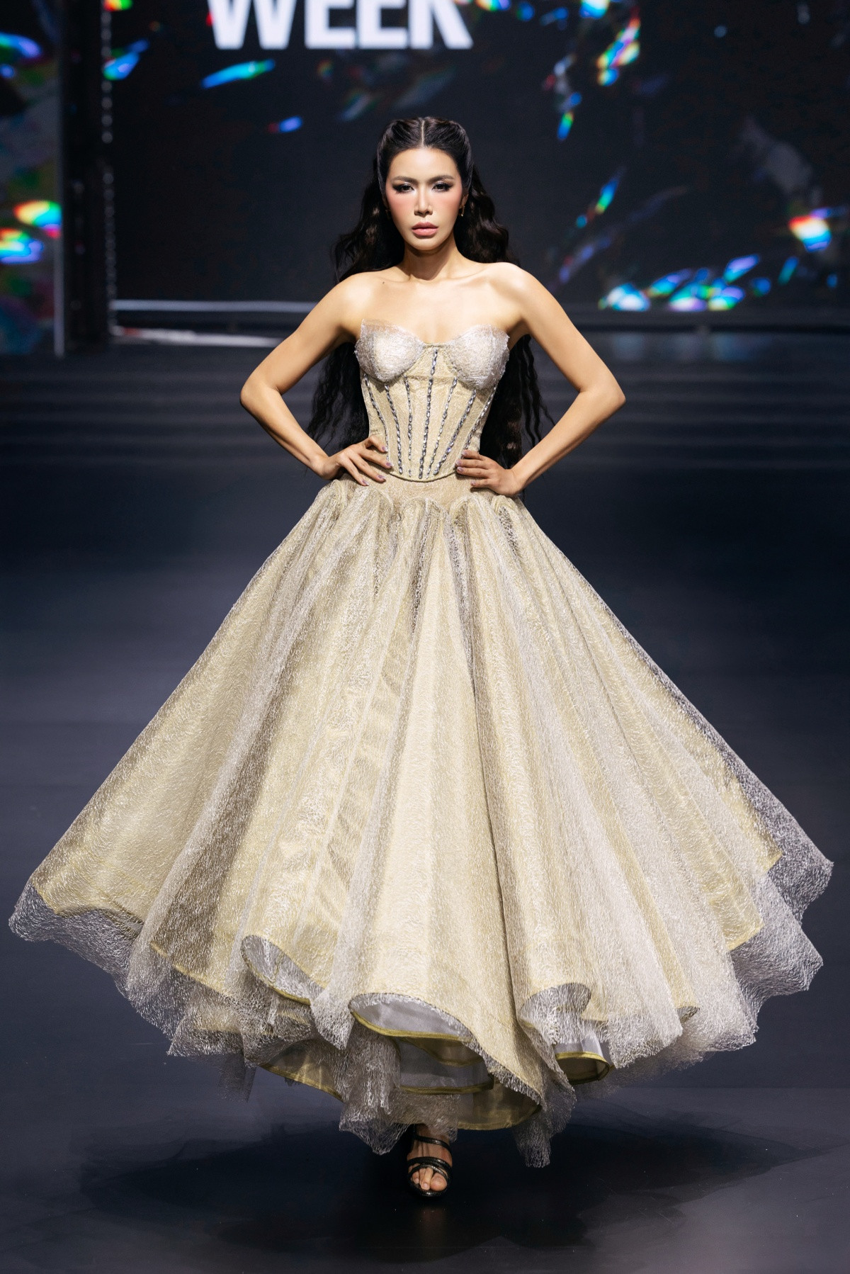 Trong làn khói mờ ảo cùng giai điệu cao trào, màn xuất hiện hoành tráng của 3 nàng hậu Lê Hoàng Phương, Quế Anh và Hạnh Nguyên lập tức trở thành tâm điểm của sàn runway. Lê Hoàng Phương nổi bật với thiết kế đầm dài được xử lý tầng lớp công phu, tạo hiệu ứng 3D sống động như những cánh hoa đang bung nở. Quế Anh và Hạnh Nguyên đồng điệu trong thiết kế cúp ngực nhấn vào phần chân váy xuyên thấu bay bổng, tạo nên bố cục thị giác hoàn hảo.
