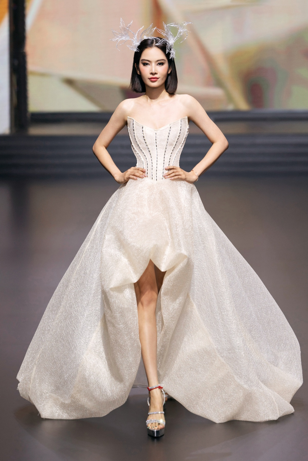 Siêu mẫu Minh Tú mở màn, cuốn hút với từng bước catwalk uyển chuyển. Cô diện thiết kế đầm cúp ngực với phần corset ôm sát.