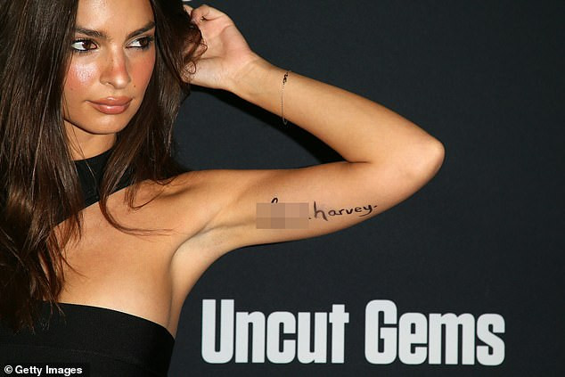 Tuy nhiên, đó không phải là lý do chính khiến Emily trở thành tâm điểm chú ý. Trong lúc tạo dáng trên thảm đen, siêu mẫu sinh năm 1991 giơ cao tay trái, để lộ ra hai từ “..(từ chửi bậy).. Harvey” viết trên bắp tay.
