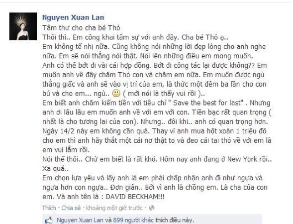 Nói thế thôi... Chứ em biết là rất khó. Hôm nay anh đang ở New York rồi... Xa quá… Em chọn lựa yêu và lấy anh là em phải chấp nhận anh đi như ngựa và ngựa hơn con ngựa.. Đơn giản... “Bởi vì anh là chồng em. Là cha của con em. Và anh tên là: DAVID BECKHAM!!!”.
