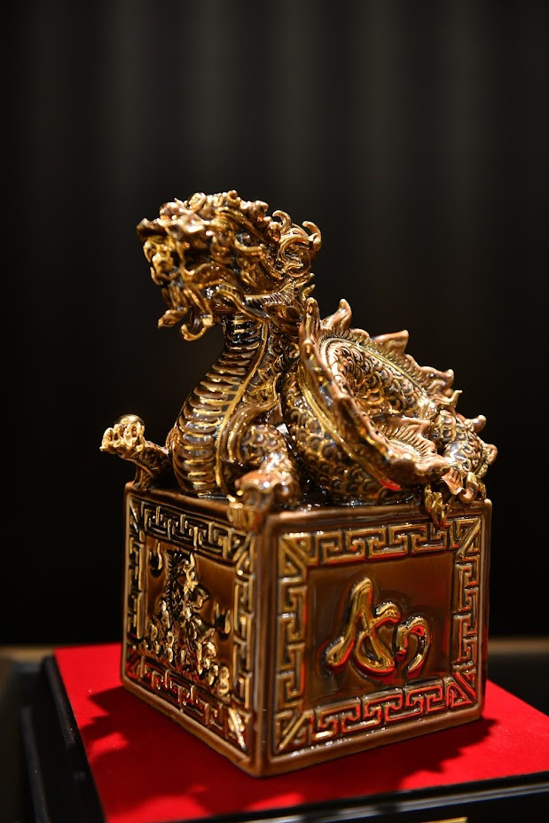 TPO - Lấy cảm hứng từ ấn Hoàng đế chi bảo vừa được đưa thành công từ Pháp về Việt Nam, các nghệ nhân tại làng gốm Bát Tràng đã mô phỏng, chế tạo những chiếc ấn Rồng bằng gốm sứ dát vàng độc đáo.