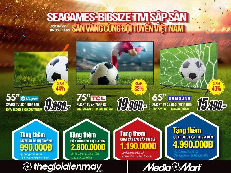 Với tín đồ hâm mộ thể thao, mùa hè cũng là thời điểm SEA Games 31 đã chính thức khởi tranh. MediaMart đã phối hợp với các hãng điện tử thực hiện chương trình ưu đãi với quy mô lớn, giúp người dùng dễ dàng nâng cấp Tivi và thưởng thức “đại tiệc” thể thao trọn vẹn tại nhà. Rất nhiều mẫu Tivi thông minh 4K big size được MediaMart giảm đến 49% trong đợt này. Đơn cử như Smart Tivi 4K 55 inch Casper 55UG6100 giá niêm yết 17,99 triệu giảm 44% còn 9,99 triệu đồng hay Smart Tivi 4K 75 inch TCL 75P618 giảm 32% còn 19,99 triệu đồng. Đặc biệt không thể bỏ qua Smart Tivi 4K 65 inch Samsung 65AY7000 UHD giảm 40% chỉ còn 15,49 triệu đồng.