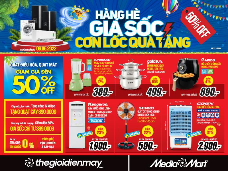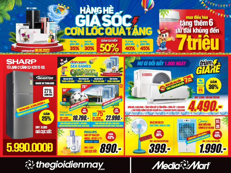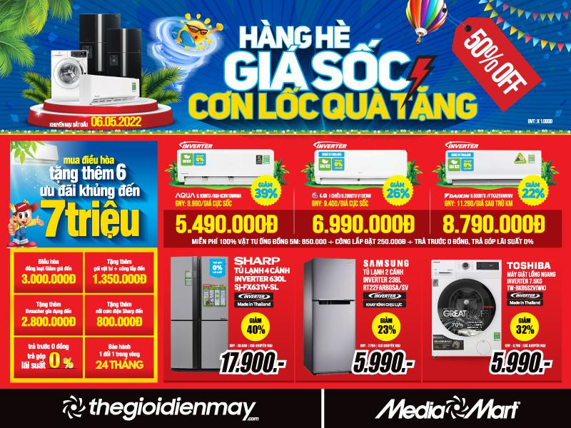 Theo đó, từ ngày 6.5 đến 3.6 hệ thống siêu thị điện máy MediaMart tung ra chương trình khuyến mại “Hàng hè giá sốc – Cơn lốc quà tặng” với loạt ưu đãi khủng như: Điều hòa giảm đến 35%, quạt mát giảm 30%, Tivi, tủ lạnh giảm 40%, gia dụng giảm lớn 45%, đặc biệt mua điều hòa tặng thêm 6 ưu đãi khủng trị giá đến 7 triệu đồng.