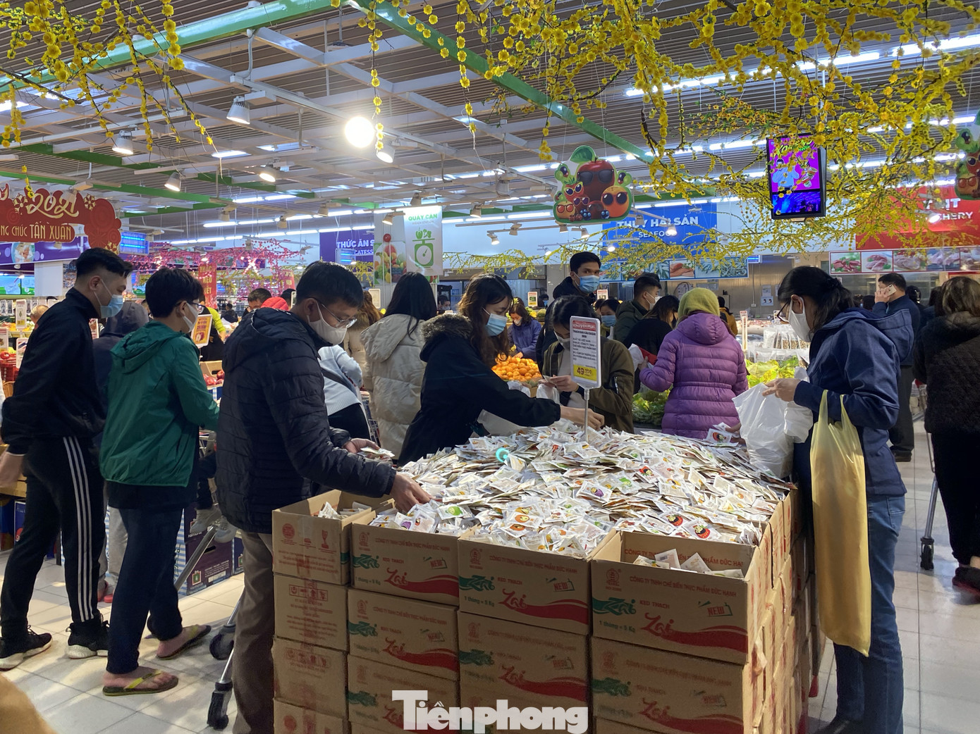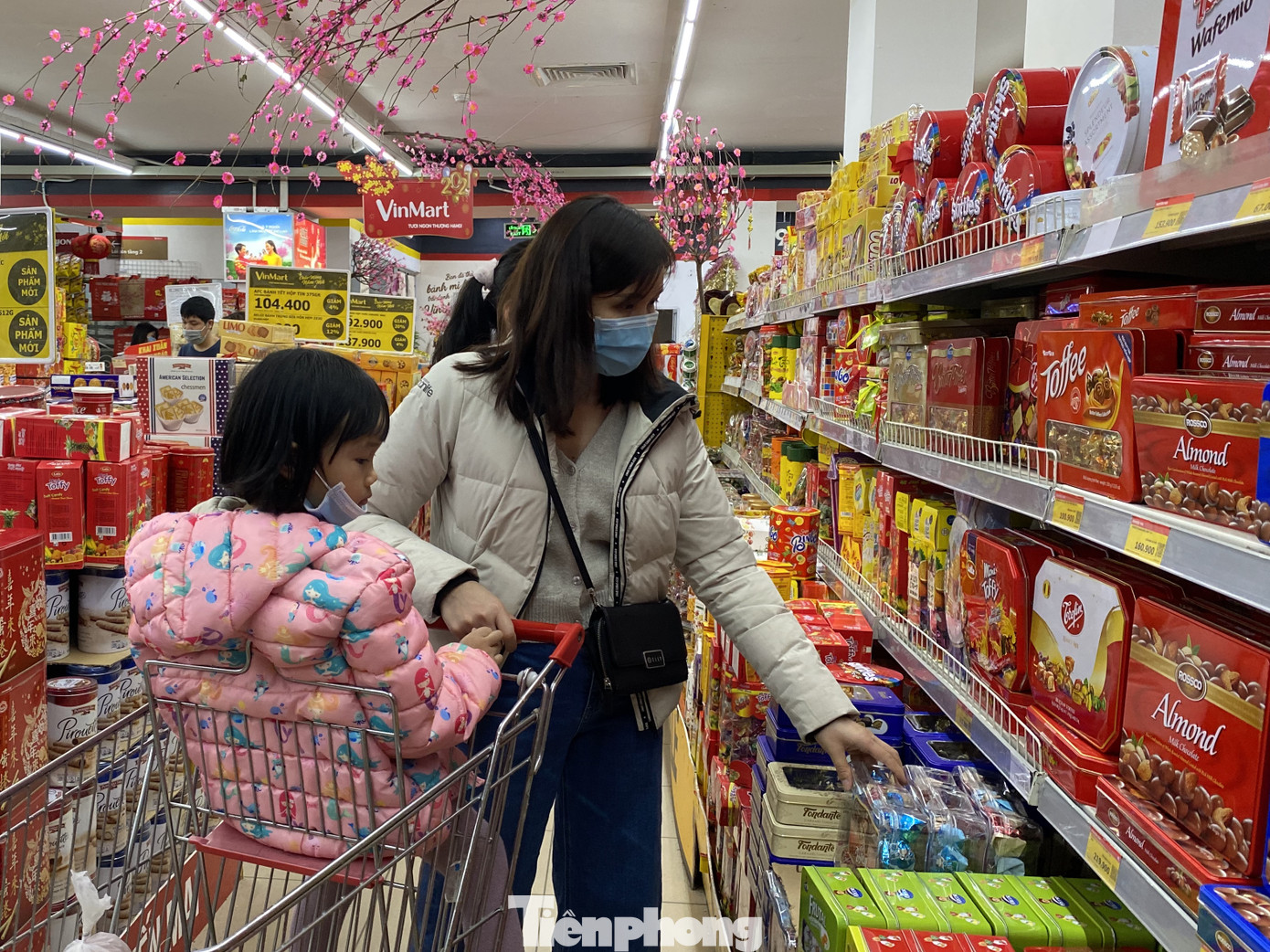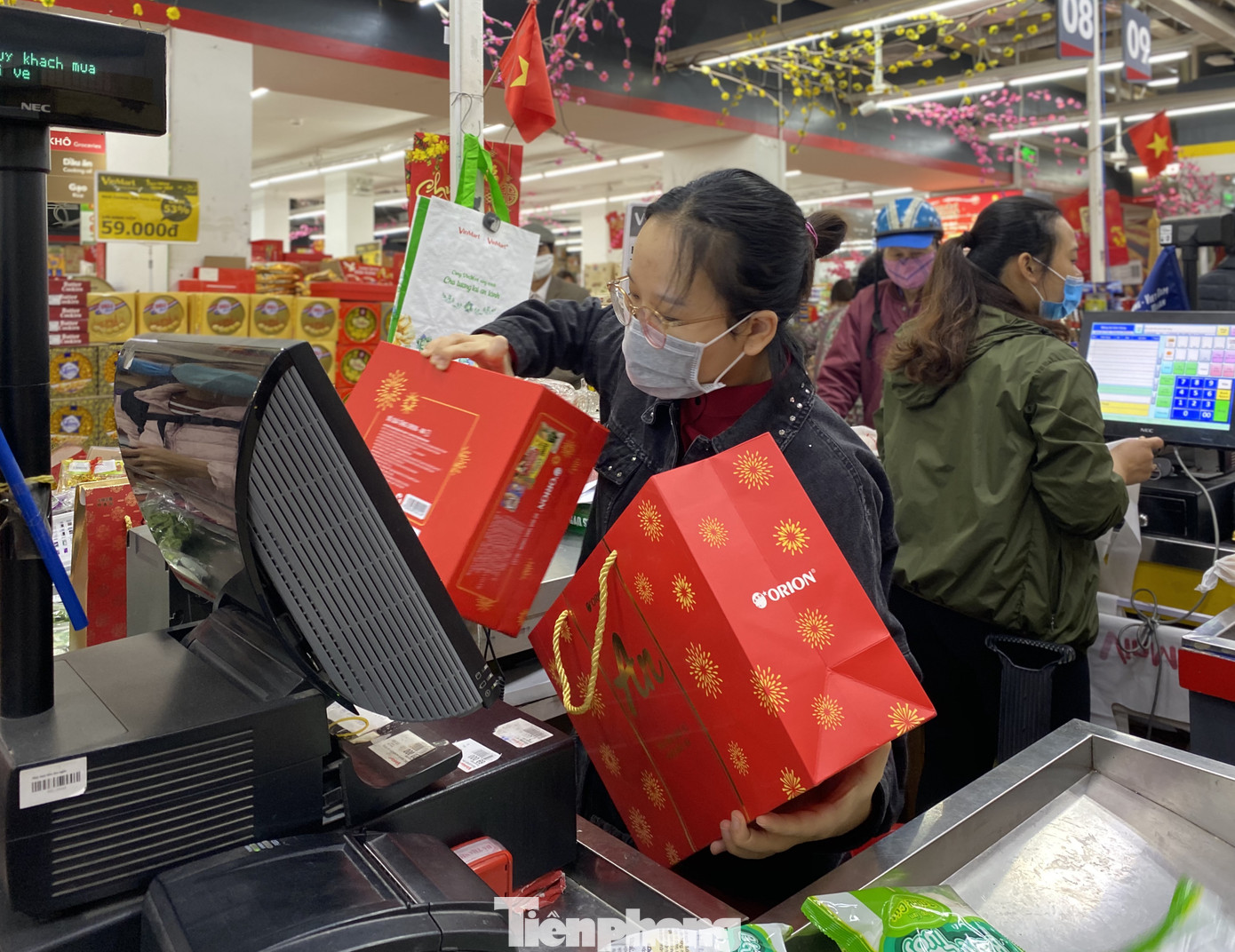 Bánh kẹo, hoa quả có mặt trong giỏ hàng của hầu hết những người tới siêu thị ngày cuối năm. Siêu thị hết sạch xe đẩy, khách chọn đồ buộc vào tay rồi tiếp tục mua sắm