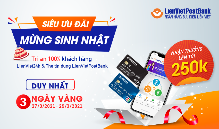 Theo đó, duy nhất 03 ngày vàng từ ngày 27/3/2021 đến hết ngày 29/3/2021, các khách hàng là chủ thẻ tín dụng quốc tế LienVietPostBank được tặng ngay 100.000VND khi kích hoạt thẻ tín dụng lần đầu tiên trên ứng dụng LienViet24h, tiền thưởng sẽ được tặng ngay vào tài khoản LienViet24h trong vòng 24 tiếng sau khi khách hàng thực hiện kích hoạt thẻ thành công. Bên cạnh đó, khách hàng cũng được tặng 100.000VND khi phát sinh giao dịch chi tiêu tối thiểu 500.000VND qua thẻ tín dụng quốc tế LienVietPostBank. Mỗi khách hàng chi tiêu qua thẻ tín dụng đáp ứng đủ điều kiện để được tặng 100.000VND chỉ được hưởng ưu đãi một lần duy nhất/1 thẻ và sẽ được nhận thưởng vào thẻ tín dụng trong vòng 05 ngày sau khi chương trình kết thúc.