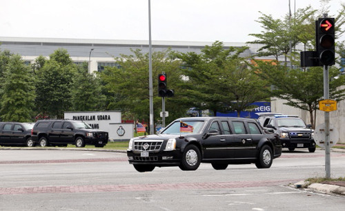 Dù đi công cán trong nước hay những chuyến viếng thăm, hội nghị ở nước ngoài, Obama chủ yếu dùng chiếc The Beast chứ không dùng xe mà nơi đến chuẩn bị. Trong ảnh, Cadillac lăn bánh ở Malaysia. Ảnh: asset.nst.