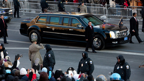 Chiếc limosine của Tổng thống Obama mang tên The Beast, là mẫu xe có khả năng chống đạn bậc nhất thế giới. Xe đeo logo Cadillac nhưng chủ yếu được nghiên cứu và phát triển ở trụ sở của hãng mẹ GM ở Detroit. Ảnh: Autoblog.