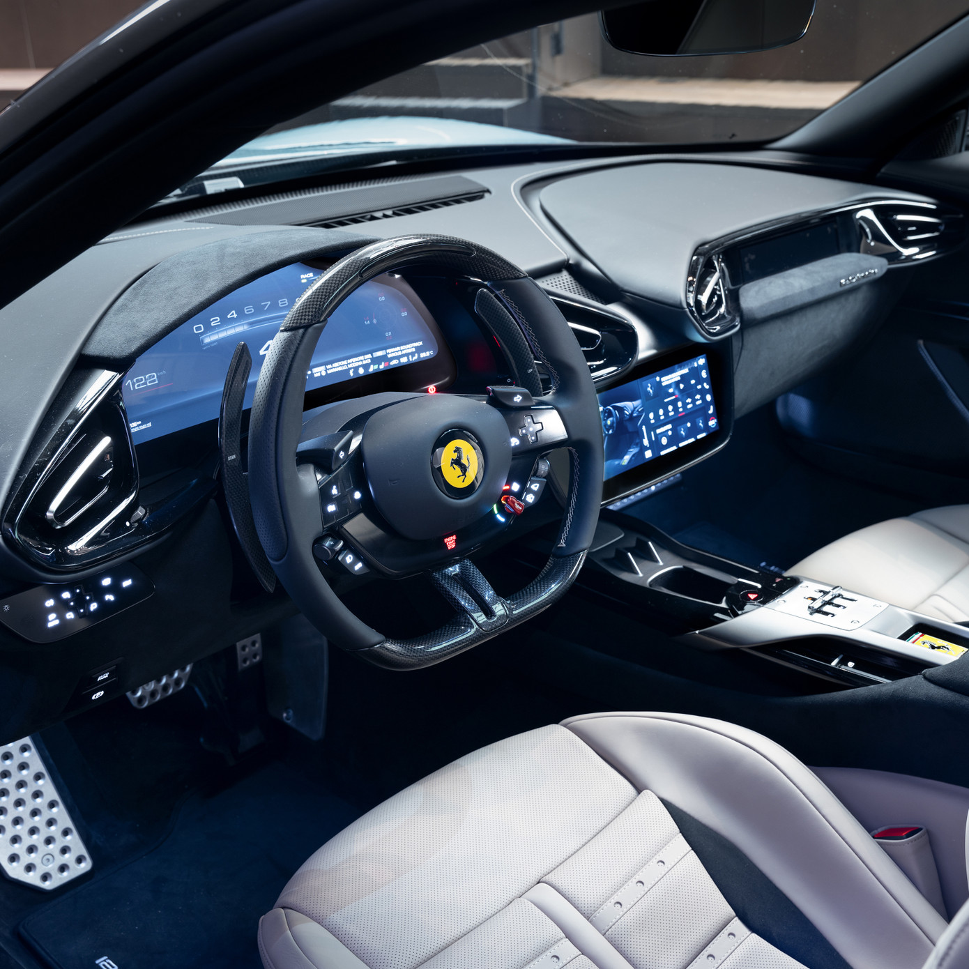Khoang nội thất của Ferrari 12Cilindri sở hữu nhiều nét tương đồng với chiếc SUV Purosangue. Điểm nhấn của không gian này là bảng đồng hồ taplo kỹ thuật số 15.6 inch đi kèm với màn hình giải trí trung tâm 10.25 inch và màn hình cho ghế phụ 8.8 inch.