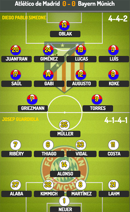 Bayern đang là đội ghi nhiều bàn nhất tại Champions League mùa này với 28 lần xuyên thủng mành lưới đối phương. Tuy nhiên, Atletico lại là đội có hàng thủ tốt nhất với đúng năm bàn thua (bằng Real). Phong cách phòng ngự kỷ luật của Simeone là yếu tố giúp Atletico loại một đội bóng có hàng công khủng khiếp khác là Barca ở tứ kết.