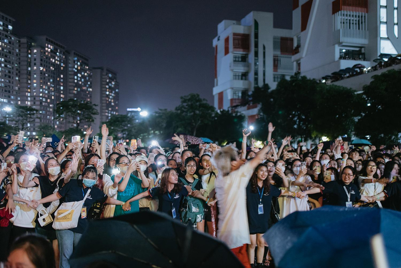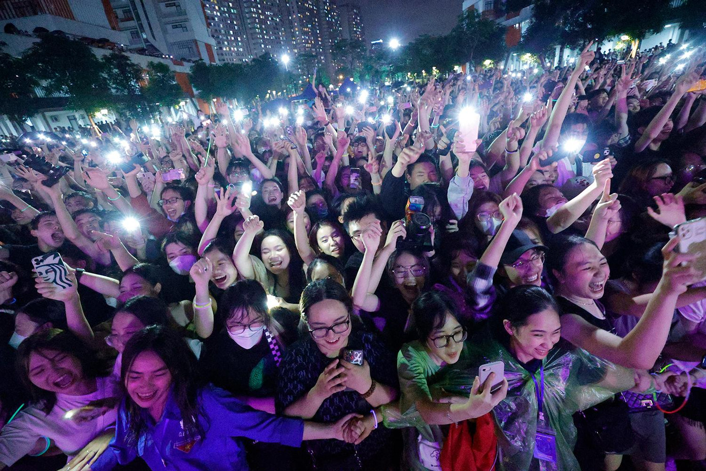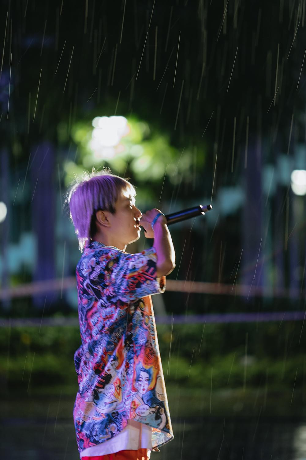 | Hàng nghìn sinh viên "đội mưa" để được theo dõi đêm nhạc hội màu sắc. |