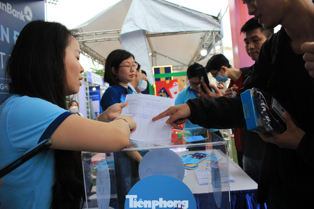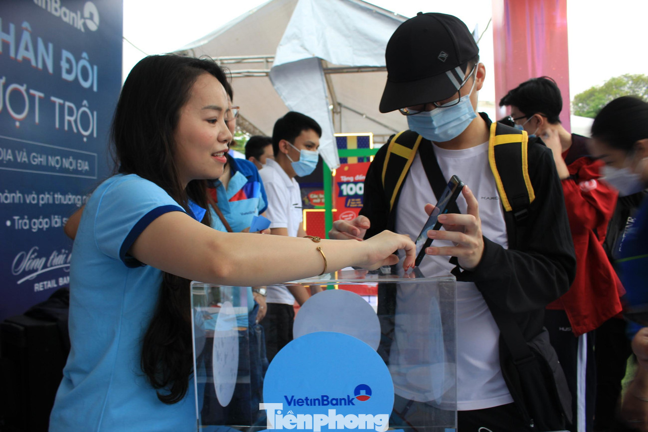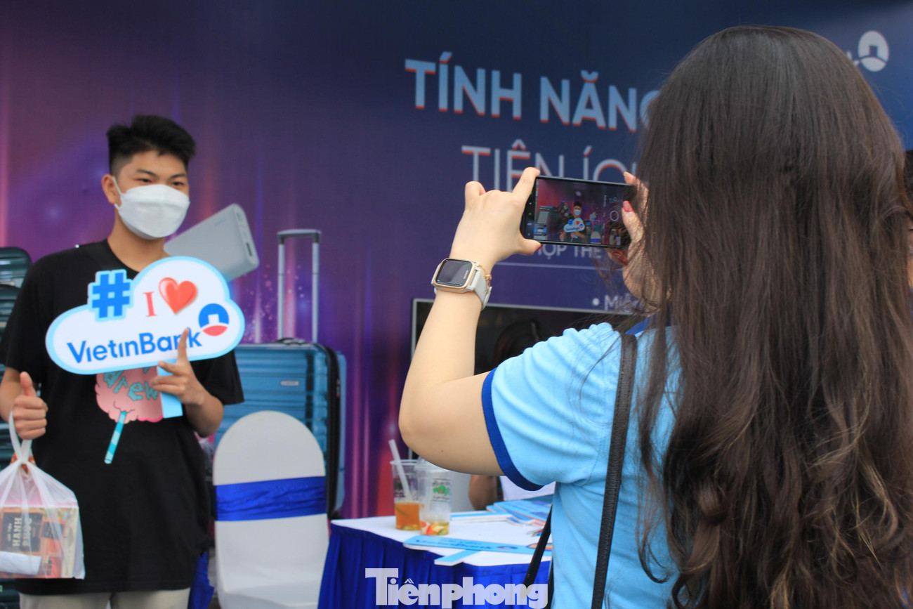| May mắn rằng khi Thanh Phương và các bạn đến nơi, trời đã tạnh và thời tiết khá đẹp. Nhóm nữ sinh viên dạo một vòng quanh sự kiện, rồi quyết định vào mở thẻ tại gian hàng của ngân hàng VietinBank |