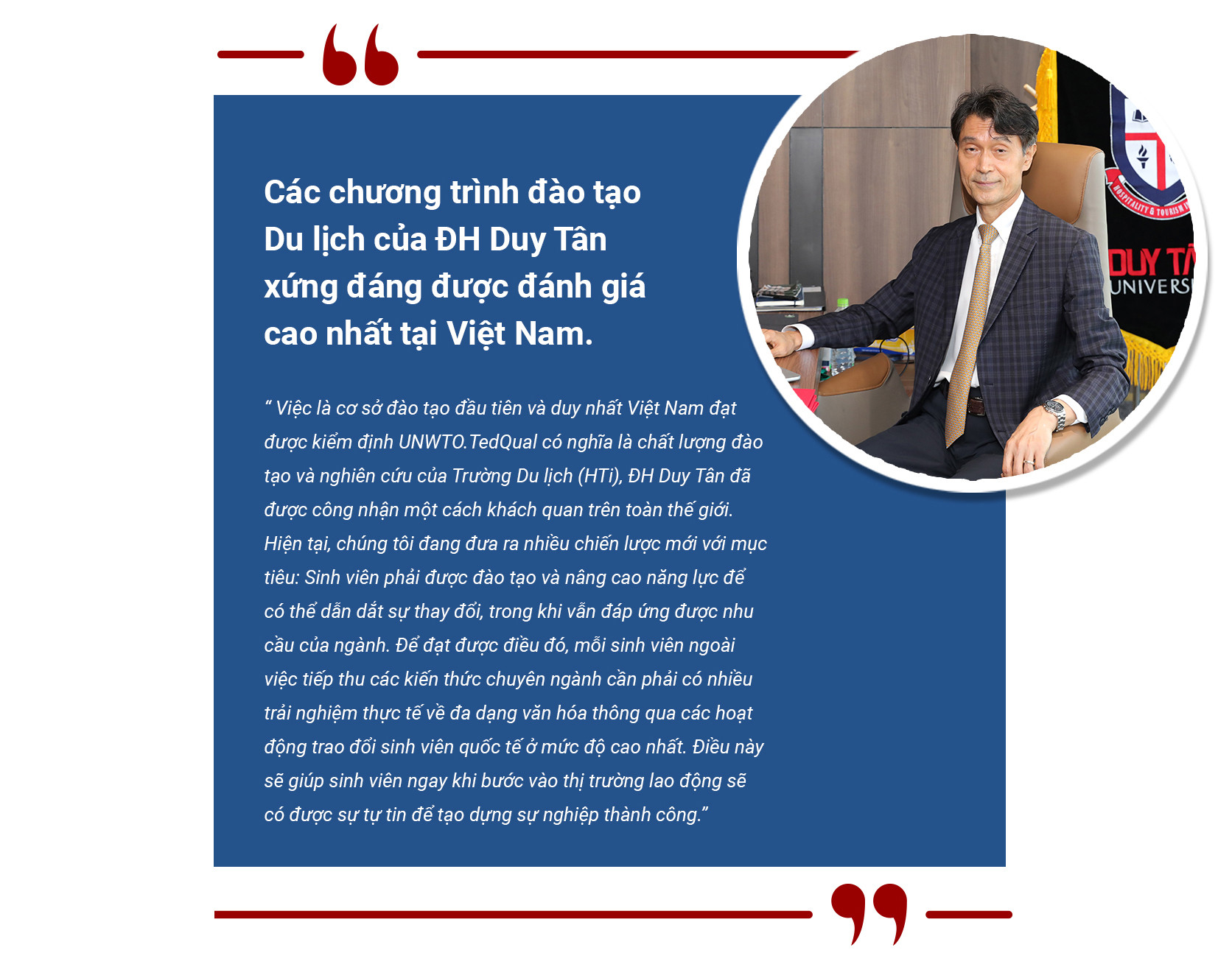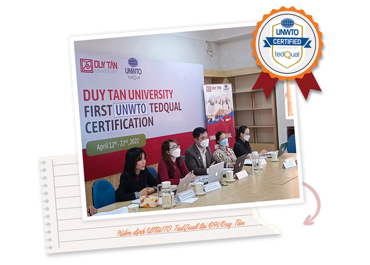 của ĐH Duy Tân chính thức đạt chuẩn kiểm định TedQual với điểm số khá cao là 771/845 điểm, thỏa mãn đến 91,2% tất cả các tiêu chí, đạt thời gian kiểm định cho 3 năm. Đây là kiểm định mà ĐH Bách khoa Hong Kong (Hong Kong PolyU) - trường xếp số 1 thế giới về Du lịch và Khách sạn trên khá nhiều bảng xếp hạng đã lựa chọn để kiểm định cho các chương trình đào tạo của mình. ĐH Bách khoa Hong Kong cũng chính là cơ sở giáo dục đã hướng dẫn và tư vấn trực tiếp trong suốt 3 năm qua giúp cho ĐH Duy Tân đạt được kiểm định này.