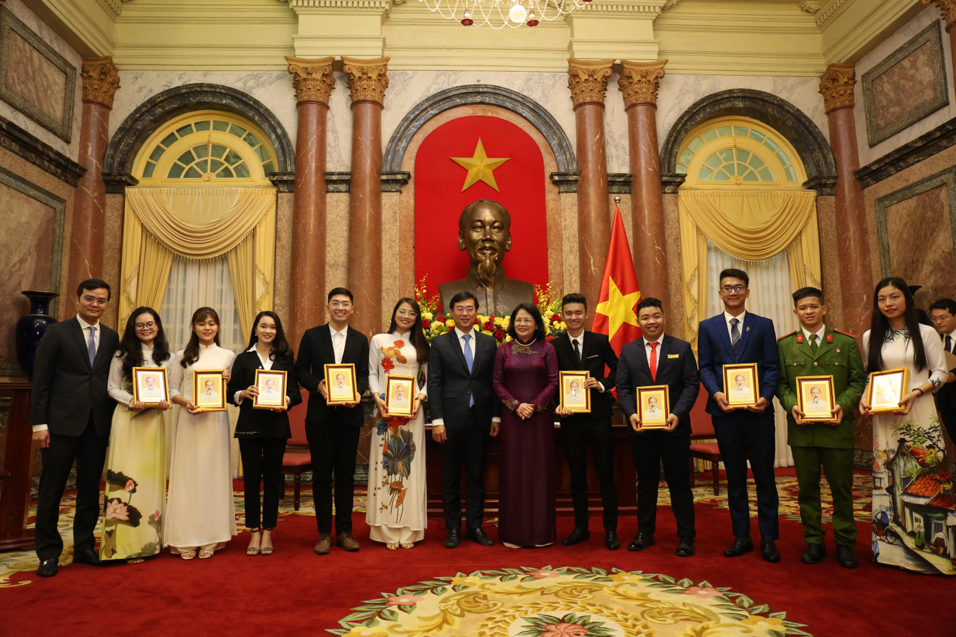 Phó Chủ tịch nước Đặng Thị Ngọc Thịnh trò chuyện với các sinh viên xuất sắc đạt danh hiệu "Sinh viên 5 tốt" giải thưởng "Sao Tháng Giêng" cấp T.Ư, năm 2019. Ảnh: Văn Điệp